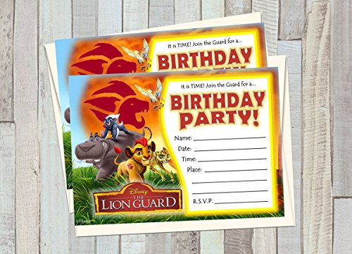 Set of 12 LION GUARD Inspired Birthday Invitations Perfect Party Supply Kits for your LION GUARD party! Includes: 12 Envelopes & 12 Invitations ready to be filled out Invitations are printed on glossy photo papers Invitation size: 5x7 inch Matching Envelopes Size 5 1/4 in x 7 1/4 in. Please note: Use Ballpoint pen to write, allow the ink to dry before you touch the cards since they are printed on glossy photo papers.Set of 12 LION GUARD Inspired Birthday Invitations Perfect Party Supply Kits for your DINOSAUR party!