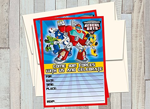 Set of 12 TRANSFORMERS RESCUE BOTS Inspired Birthday Invitations Perfect Party Supply Kits for your SUPER HEROES party! Includes: 12 Envelopes & 12 Invitations ready to be filled out Invitations are printed on glossy photo papers Invitation size: 5x7 inch Matching Envelopes Size 5 1/4 in x 7 1/4 in. Please note: Use Ballpoint pen to write, allow the ink to dry before you touch the cards since they are printed on glossy photo papers.Set of 12 TRANSFORMERS RESCUE BOTS Inspired Birthday Invitations Perfect Party Supply Kits for your SUPER HEROES party!