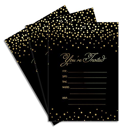 25 "You're Invited" 5x7 gold glitter confetti party front and back printed invitations with envelopes. Fill in fields read, "for, date, time, where and RSVP". Includes a gold metallica Gelly Roll pen for elegantly completing personalization fields. Includes bright white, gum moistened envelopes (24lbs) for postcard style invitations. Please allow ample drying time when using the gel ink pens. Made in the USA. Perfect for Birthdays, New Years, Anniversaries, Proms, Weddings, Bachelor/Bachelorette parties, Bridal Shower, Baby Shower, Graduation, Family Reunions, Bar Mitzvah or just a Saturday night!25 "You're Invited" 5x7 front & back gold glitter confetti party invitations with envelopes