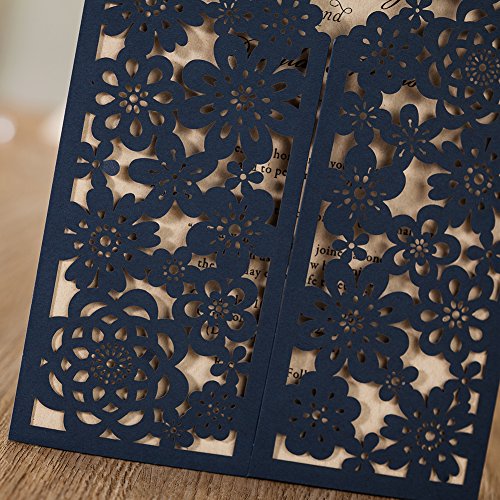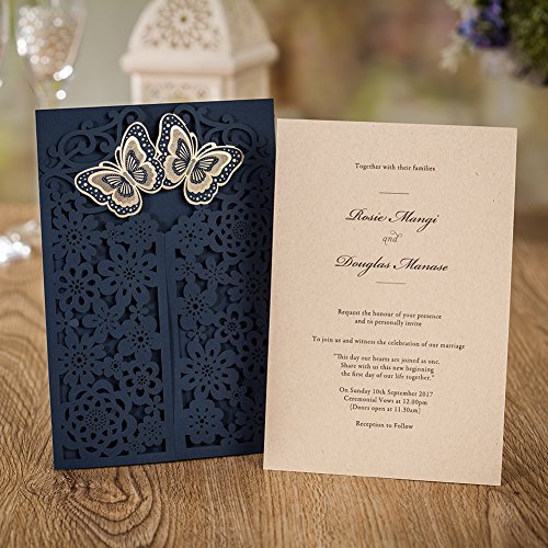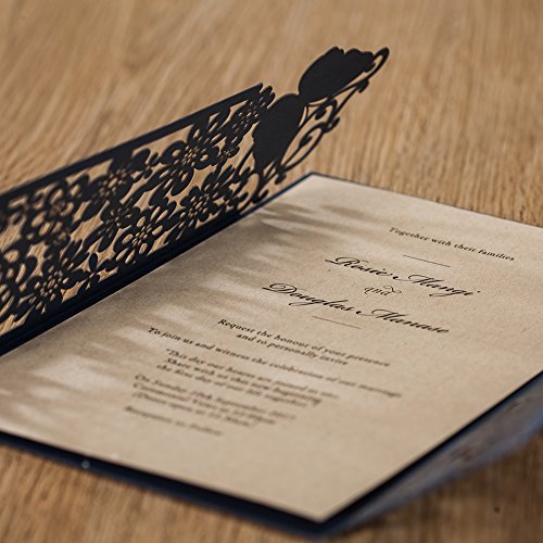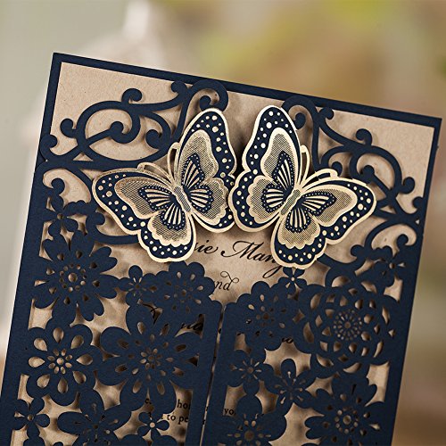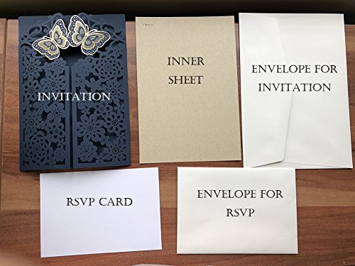 MAKE YOUR SPECIAL MOMENT MORE PRECIOUS: 1. Blue 3D laser cut card holder / pocket is adopting beautiful hollow butterfly floral gate design. 2. The printable inner sheet is made of brown craft thick paper, it is completely blank. 3. The envelope is white. 4. The invitations are all made of high-quality cardstock paper, which is very thick and study, so much better than any other similar products. 5. Don't hesitate, impress your guests and friends with these chic and elegant invitation cards.