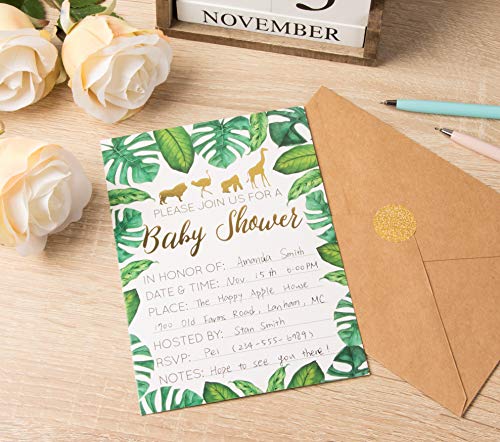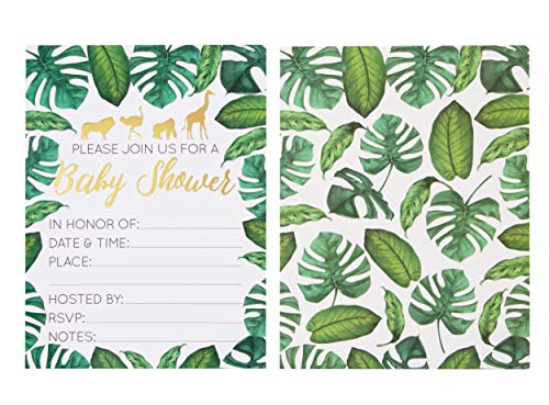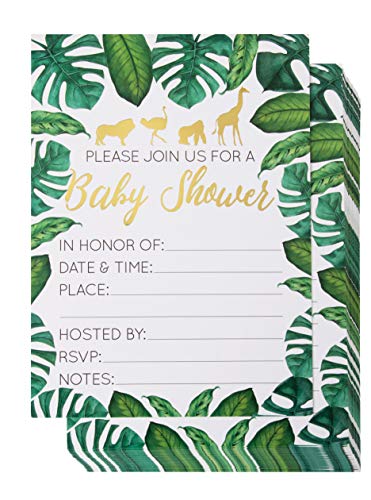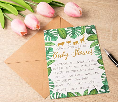 The tropical safari theme invitation cards 36 count set with brown envelopes is ideal to handwrite your event details including the expectant parents' names, date, time, party venue, RSVP details, and notes. The green palm leaves and safari animal silhouettes in gold foil design is perfect for your wildlife themed party! Each card is made from high quality paper which is thick, durable, and easy to write on. Hurry up and annouce the upcoming fun party, dinner, or lunch!ELEGANT AND CUTE DESIGN: Contains 36 postcard style invitation cards with tropical palm leaves design on both sides and silhouettes of a lion, ostrich, gorilla, and giraffe in gold foil on the front side.
