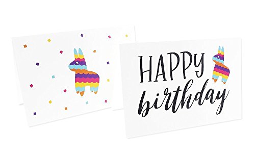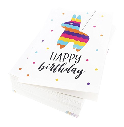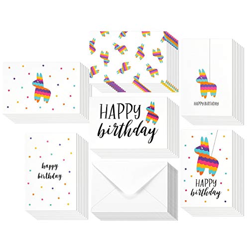 This assorted pack of 48 Happy Birthday greeting cards will prepare you for all your card-sending needs! Cut the hassle of rushing to the store and overpaying for cards. This pack consists of 48 blank greeting cards to include your very own custom messages. Make a statement with these thank you cards made of high-quality card stock that feel thick and sturdy.HAPPY BIRTHDAY CARD BOX SET: 48 pack of Happy Birthday greeting cards featuring colorful pinata designs