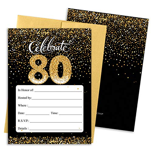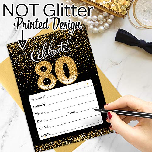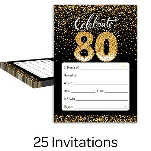 Order includes 25 Count - Fill In the Blank - Post Card Style - Black and Gold Celebrate 80 Party Invitations with Self-Sealing Metallic Gold Envelopes. Invitations are 5" x 7" and Feature Faux Glitter Gold "Celebrate 80" Party Header. Use for your upcoming 80th Birthday Party.Celebrate 80 years in style - with classy black and gold Celebrate 80 party invitations.