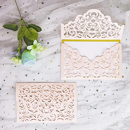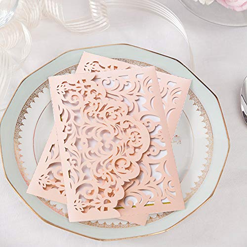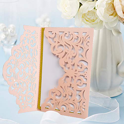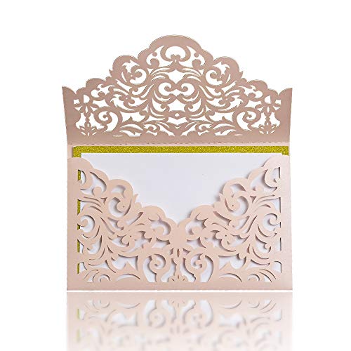 5 x 7 inch blush laser cut wedding invitation with free ivory envelopes. Background paper and inner pages are separate, just print and put the inner pages on the gold card.