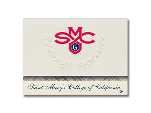 Saint Mary's College of California “Print Your Own” Graduation Announcements, Platinum Style, Basic Package. Signature Announcements’ Platinum Tri-Panel Announcement actually opens both Up: Top panel with your Logo/Mascot; & Down: Bottom panel with your school name. When the top panel is raised, you will see a beautifully sculpted embossing of a graduation cap and diploma. They are made of linen textured 92lb card stock and are Foil Stamped using sculpted dies by skilled artisans. They are the perfect size for a 3x5 graduation photo insert. Students across the country agree with you - Your Once-in-a-Lifetime event demands the highest quality, most professional announcement available. This is why our Platinum Announcements are Rated #1. You just spent four years achieving a great accomplishment. Show your friends and family how proud you are and how far you have come. Choose Signature Announcements quality to present your new image. Our college graduation announcements are Officially Licensed and approved by IMG Collegiate Licensing, Learfield College Licensing and many independent college licensing associations across the United States. If your school has a licensing program, we want to be licensed. A portion of all licensed sales are given back to your university to help support student life and scholarships. Basic Package: Graduation Announcements (20) “Print your own”; Foil-lined inner Envelopes (20); Foil-lined outer envelopes(20); Announcement Keepsake (1).20 saint mary's college of California "Print your own" graduation announcements