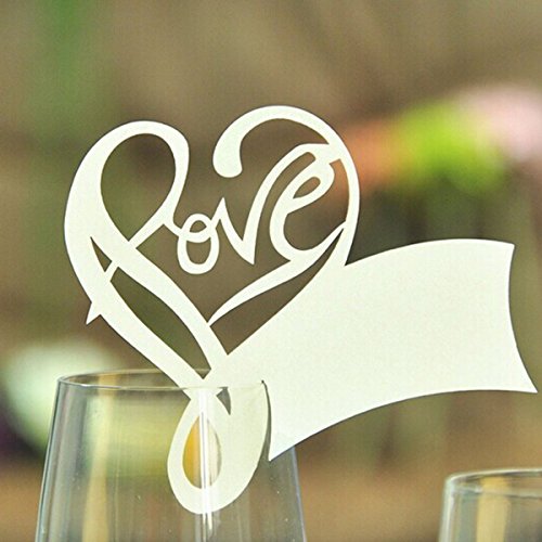 This item is a pack of 50pcs beautiful hollow heart LOVE wedding card, made of high quality pearlized paper and cut by laser workmanship. Suitable for wedding table place cards, wine glass cards make fabulous and stunning wedding decoration.