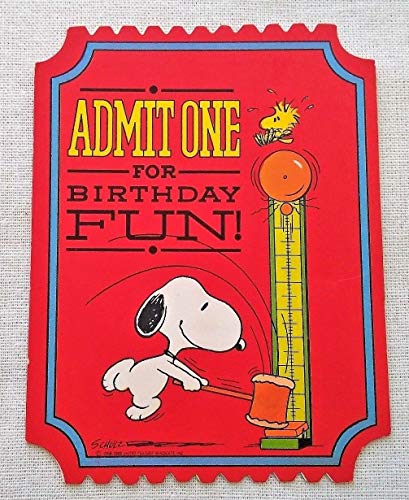 Vintage 1970s - MINT in Original Package! This is a special package of 8 SNOOPY Birthday Party Invitations (and envelopes), featuring SNOOPY and WOODSTOCK. Snoopy is hitting a mallet on one of those old-time strength measuring machines at a carnival. The card itself is die-cut outline with scallops, cut to resemble a CARNIVAL TICKET. Top reads ADMIT ONE FOR BIRTHDAY FUN! Inside reads A SEATS RESERVED FOR YOU! It has lines for DATE, TIME, PLACE, and SIGNED.Vintage 1970's Hallmark Snoopy Package 8 Invitations & Envelopes
