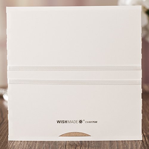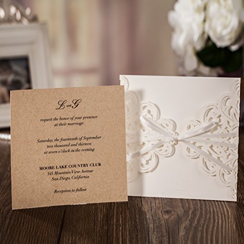 HIGH QUALITY CARDSTOCK INVITATIONS PAPER AND DESIGN : laser cut wedding invitations with ribbon bowknot ,it is very beautiful hollow lace floral silk ribbon design invitations cards. white pocket ,printable Kraft inner sheet.white envelope,gold adhesive stickers