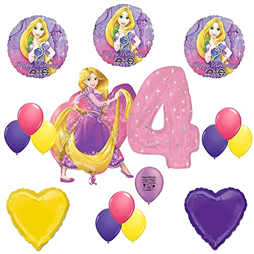 Tangled Rapunzel Disney Princess 4th Birthday Party Balloon Decorations Supplies (1) 40 inch Pink Sparkle Number 4 Foil Balloon (3) 18 inch Tangled Happy Birthday Foil Balloon (1) 18 inch Yellow Heart Foil Balloon (1) 18 inch Purple Heart Foil Balloon (6) 11 inch Latex Balloons in yellow, purple and pink (1) 11 inch Happy Birthday Custom Latex Balloons, colors varyTangled Rapunzel Disney Princess 4th Birthday Party Balloon Decorations Supplies