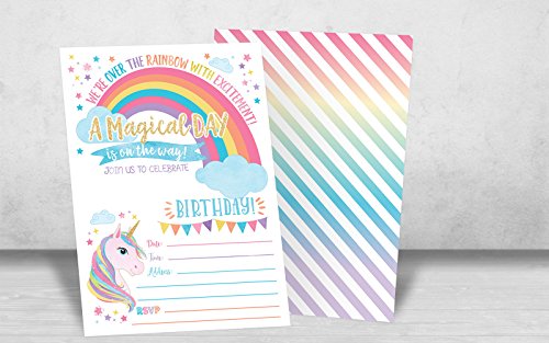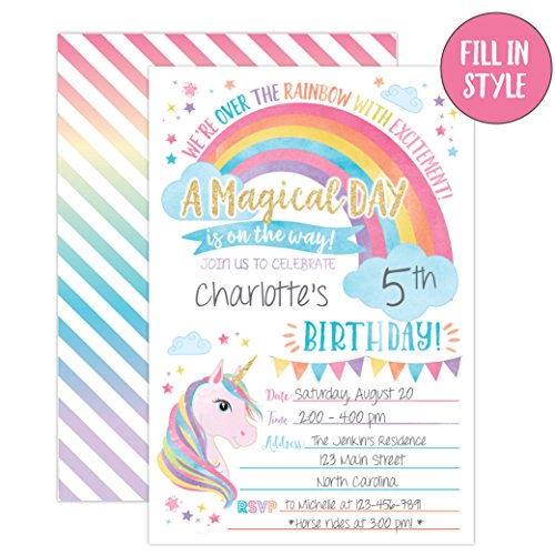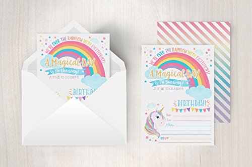 Handwrite your event details in the spaces provided, and invite your guests with these premium fill in unicorn party birthday invitations. These rainbow invites are perfect for your magical unicorn party! Professionally printed on premium heavy weight cardstock and designed and printed exclusively by Your Main Event Prints in the USA.Includes 20 Invitations and 20 White Envelopes